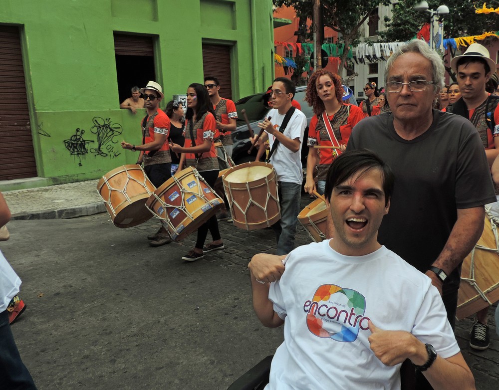 Ao todo, 50 jovens com deficiências participam pela primeira vez do encontro de maracatu, como é o caso de Felipe Suassuna. Com dificuldades motoras nos braços, pernas e na dicção devido à meningoencefalite, ele não precisou verbalizar a felicidade em estar participando da manifestação cultural. Bastou, apenas, sorrir com os olhos. “Ele nos pede alguma coisa e a gente cumpre. Não tem como dizer não a ele”, comenta o pai, o arquiteto Fred Lima.