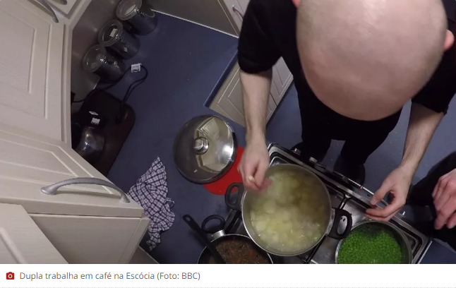 A dupla prepara as entradas e pratos principais para cerca de 10 a 15 pessoas, duas vezes por semana, em um café na Escócia.
