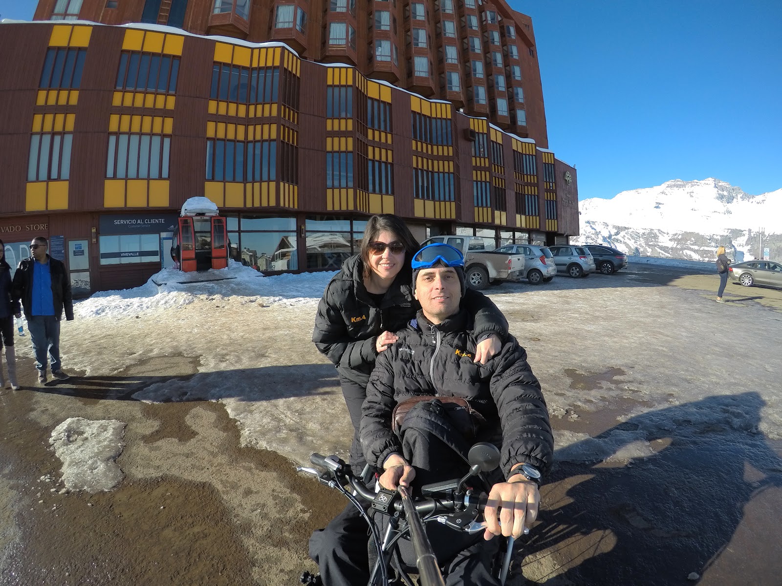 Enviei alguns emails para a responsável pelo esqui adaptado no Valle Nevado, a Myrian Torralbo (mtorralbo@vallenevado.com) em 2015 e ela me explicou que o equipamento é seguro, tem instrutores especializados e toda infra estrutura necessária às aulas de esqui adaptado. Aulas? Eu me perguntei. Eu não quero virar profissional, só experimentar! Ela me explicou que, se a pessoa quiser se tornar um esquiador amador, ou até profissional, após algumas aulas você pode esquiar sozinho. As primeiras aulas, são com o instrutor te levando, segurando o “monoesqui” – é como eles chamam a cadeira. Eu iria em setembro daquele ano, mas já sabem porque não fui. Passou o tempo, e este ano resolvi ir no início de junho e experimentar o esqui adaptado. Mandei emails para a Myrian novamente, e a primeira resposta que ela me deu me deixou muito chateado: estariam fechados, só abririam no final de junho. Poxa, já tinha comprado passagem, reservado hotel… Pesquisei antes, e disseram que a temporada de esqui é de junho a setembro, por isso fiquei tranquilo. Mas não comuniquei com ela antes. Bola fora. Felizmente, duas semanas antes de embarcar para o Chile, caiu uma nevasca por lá e permitiu adiantarem a temporada. Ufa!