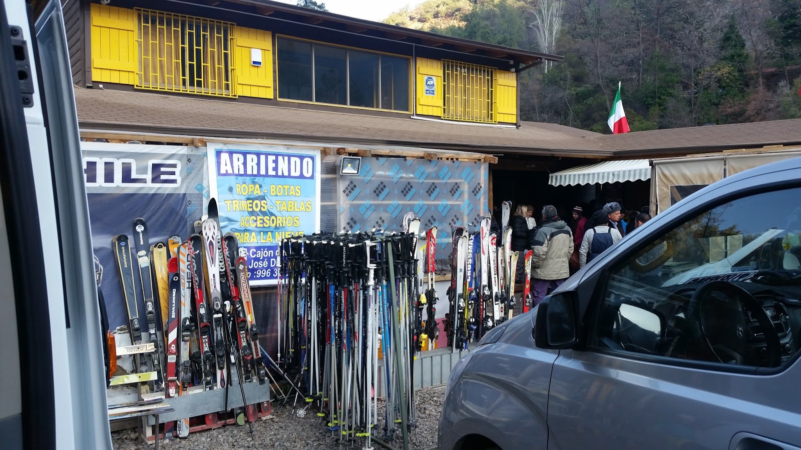Reservei uma van para o Valle Nevado com antecedência, por indicação da minha irmã, que mora em SP, com a Fabiana, da BraChil Turismo, pelo WhatsApp (+56 9 6259-0772). Tudo em português, ela me disse que já tinha experiência com cadeirantes e a van me pegaria no hotel. Foi tudo como combinado, porém a van – como todas que peguei lá – era muito alta, e precisei ser carregado até o banco. Se não fosse o pessoal que estava indo junto – dois rapazes se ofereceram para ajudar – seria bem complicado subir. Seguimos viagem, e no pé da montanha, logo antes da subida principal, tem uma loja enorme para alugar roupa e material de esqui. Não deixe de alugar roupa completa, inclusive bota, e se for esquiar alugue capacete também.