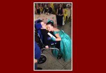 Maria Clara conduziu Enzo, 4 anos, que tem paralisia cerebral, girando a cadeira de rodas no baile de conclusão da educação infantil.